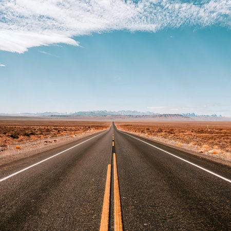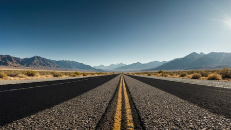 Endless Desert Highway Stretching Towards Majestic Mountains Beneath a Bright Blue Sky Landscape