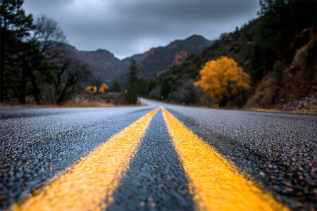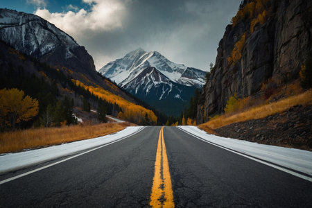 Long Winding Yellow Asphalt Road Under Dramatic Grey Clouds Leading to Majestic Mountain Viewscape
