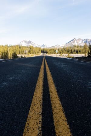 Vibrant Yellow Lines on a Serene Roadway Leading Towards Majestic Mountains Under a Clear Blue Sky