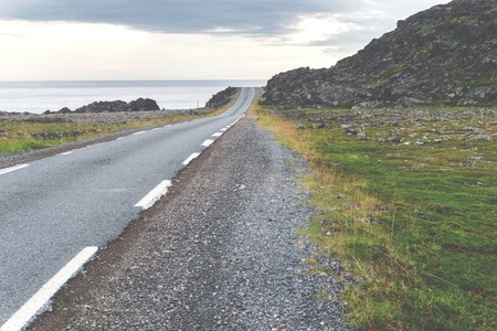 Rocky cliffs along the Varanger National Tourist Route on the coast of the Barents Sea, Finnmark, Norway