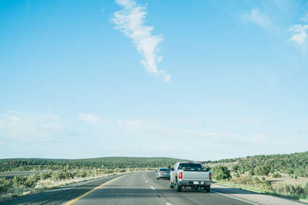 good weather sight of pickup car and compact driving ahead on straight roadway. road trip vehicles running on route with azure sky overhead.