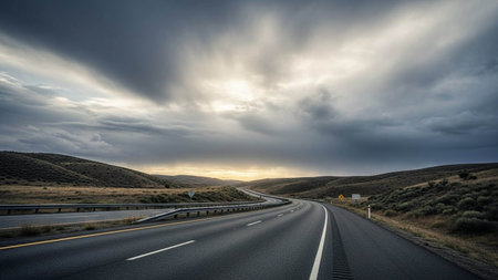 Empty highway winding through a mountain landscape. Vast, open road stretches into distance