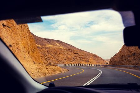 Driving a car on the mountain road in the desert. View of sandstone mountains through the windscreen. The road from Arad to the Dead Sea. Israel