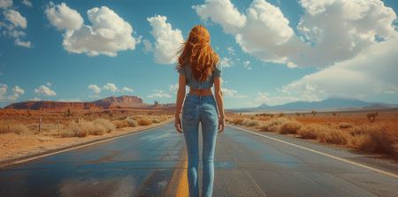 A woman with long, red hair walks barefoot on a paved road in the desert. The road stretches out into the distance, with a beautiful blue sky and white clouds above.