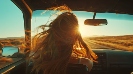 woman driving with the windows down, hair blowing, and music playing, generative ai