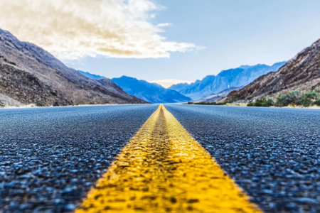 Vibrant Yellow Lines on a Serene Roadway Leading Towards Majestic Mountains Under a Clear Blue Sky
