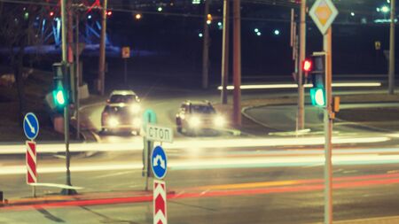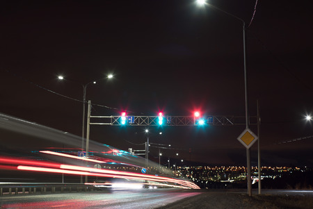 Time exposure photo with a street at night and automobile headlights and traffic light. Crossroads. Timber carrying vessel