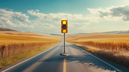 A traffic light shows yellow at a country road junction with no vehicles or pedestrians around, surrounded by open fields and nature