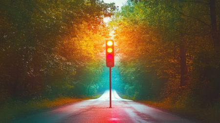 A captivating stoplight stands alone on a tranquil road, surrounded by lush trees and dappled sunlight, evoking a serene yet vibrant atmosphere in nature.