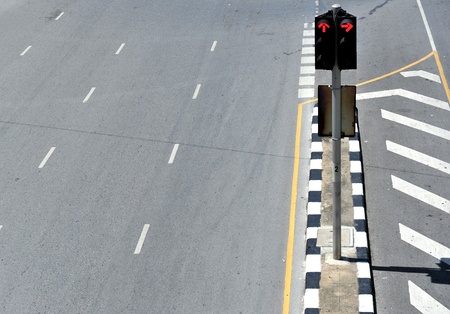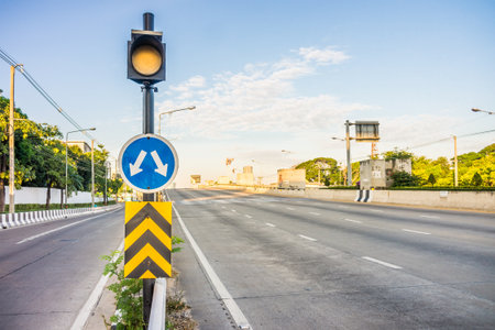 Traffic Light Signal, Pass Either Side Sign, Dangerous Obstruction Warning Sign and Road Markings. Traffic signs in Bangkok city, Thailand.