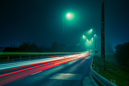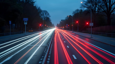 Captivating night scene of a bustling highway with vibrant light trails from moving vehicles, demonstrating urban energy and the rhythm of city life.