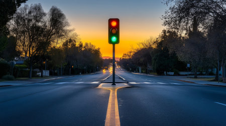 A tranquil view of a deserted intersection at dusk, featuring a traffic light with green and red signals against a stunning sunset backdrop. Perfect for urban and landscape themes.