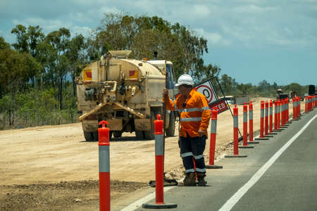Bruce Highway Townsville to Mackay, Queensland, Australia - November 2021: Water truck spraying water to lay dust on highway construction project with worker looking on