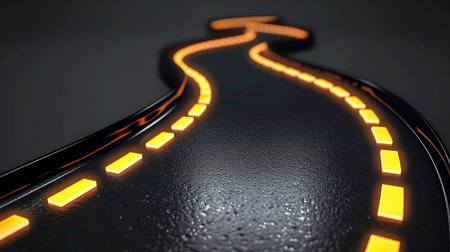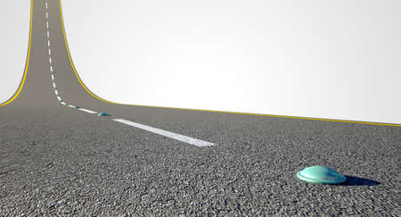 A concept of an ashpalt road with reflectors and paint road markings curving upward to the sky on an isolated white background