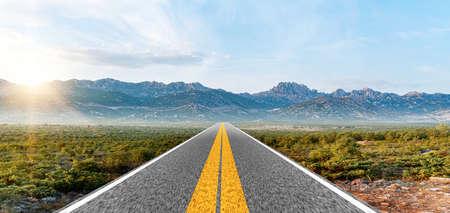 Country road background and colorful sunset landscape..Car travelling and scenic desert road.Adventures and destination concept.