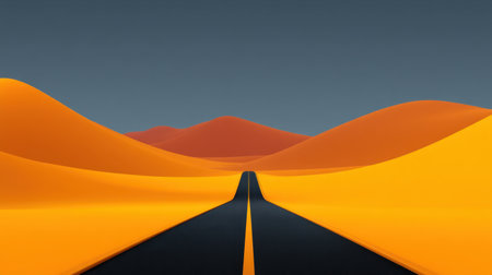 A captivating desert landscape featuring smooth orange sand dunes and a straight road stretching towards the horizon under a clear sky, ideal for travel themes.