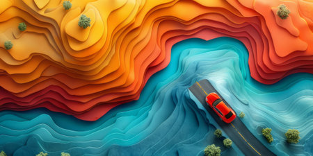Red car driving through vibrant, abstract landscape with colorful layered hills and small trees.