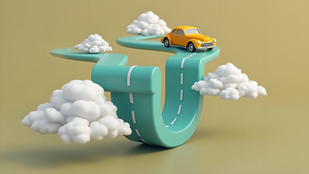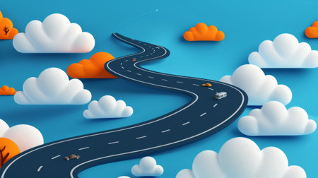 A cheerful yellow car traverses a whimsical road winding through fluffy clouds. This vibrant 3D rendering evokes adventure and the joy of travel.
