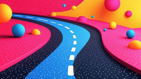 A visually striking abstract scene featuring a winding road amidst colorful spheres. Ideal for creative projects, graphics, and modern design.