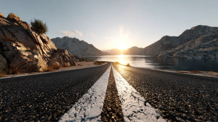 A stunning view of a winding road leading directly toward a brilliant sunrise, reflecting upon a serene lake nestled among majestic mountains.