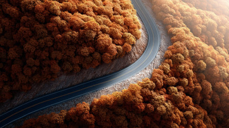 Aerial view of a scenic highway winding through a dense forest displaying vibrant autumn foliage, bathed in the warm glow of the setting sun, creating a picturesque autumnal landscape