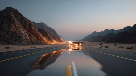 Explore a serene desert road at dusk, where stunning mountain reflections dance on the water surface, inviting adventure and tranquility.