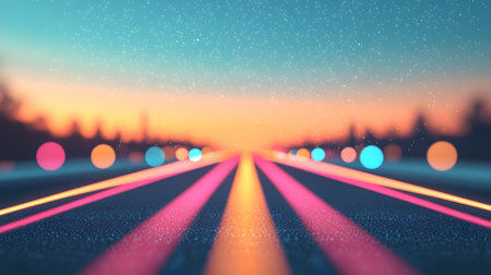 Vibrant streaks of neon colors carve through glossy black asphalt under night sky, capturing dynamic motion and urban energy in mesmerizing detail.