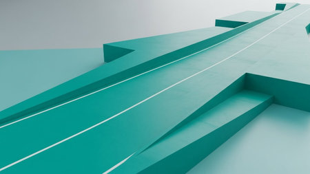 An abstract aerial view showcases a modern road intersection painted in a striking teal color. White lane markings, including solid and dashed lines, clearly define the multiple lanes and curves of the road network. The intersection a complex arrangement of turns and straightaways, creating a geometric and organized pattern. The smooth, clean surface of the asphalt and the crisp white lines suggest efficiency and modern transportation