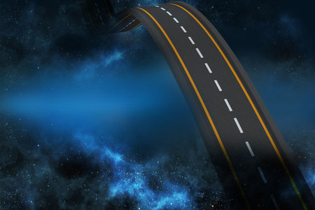 Floating ribbon-like highway is twisting through cosmic nebula, in flat design with dashed lanes. Futuristic, surreal, abstract, sci-fi, minimalist, cosmic, navigational