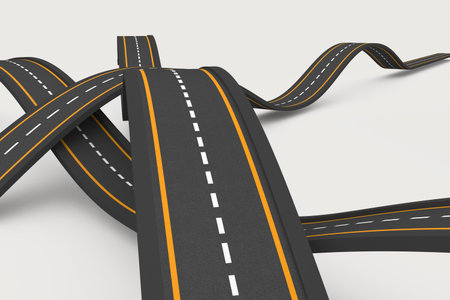 Showing twisting asphalt roads with yellow edges, white dashed centers on white backdrop, 3D render. Abstract, futuristic, geometry, dynamic, landscape, innovation, minimalism