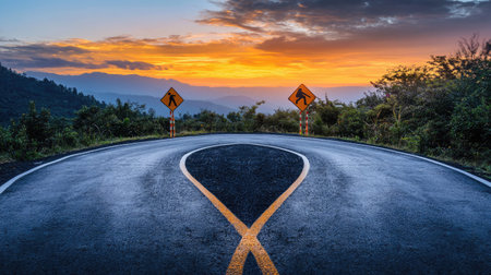 A stunning curved road stretches through a picturesque mountain landscape, framed by vibrant sunset hues and caution signs, evoking a sense of adventure.