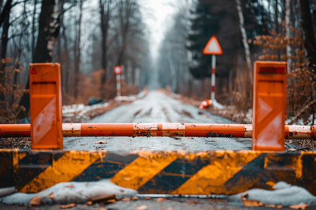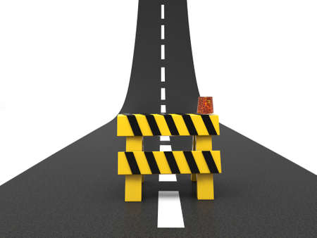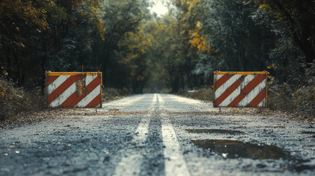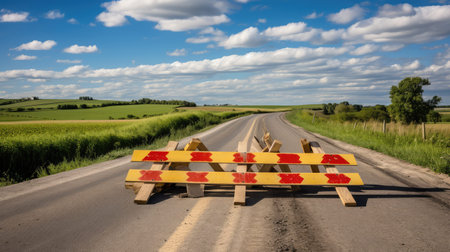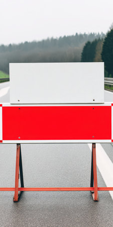 Road barrier with blank white and red signs blocking an empty highway, symbolizing detour, closure or obstacle on a journey ahead, uncertainty and halted progress