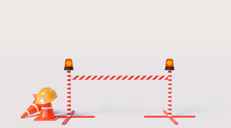 Traffic road barrier: A warning barrier for road closure and website under construction page. Includes warning and stop signs, roadwork, traffic barricades, cones, and safety barricades.