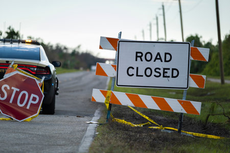 Florida USA - October 2016 - Road closed sign and materials to repair a highway on the Gulf Coast