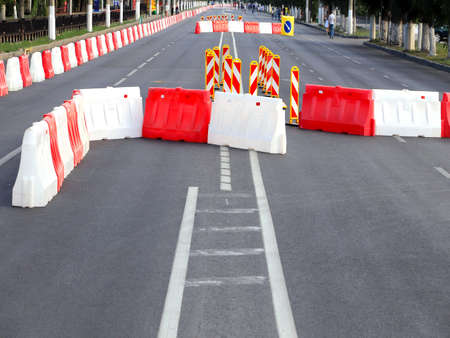 Heavy concrete roadblocks blocking highway or street. Obstacle, dead end or obstruction to progress concept.