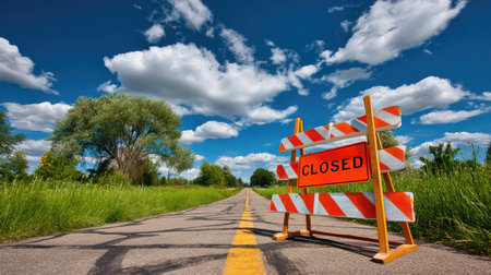 A striking image of a closed road sign on a rural pathway, framed by vibrant grass and a captivating blue sky adorned with fluffy white clouds.