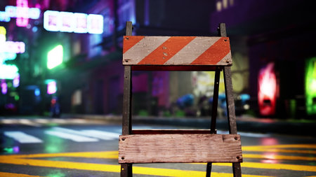 A wooden barricade stands on a rain soaked street surrounded by bright neon signs. The street is empty, creating a mysterious and vibrant nighttime atmosphere.