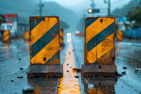 Bright orange warning lights atop road construction barriers signal drivers to exercise caution while approaching the work zone on a cloudy day.
