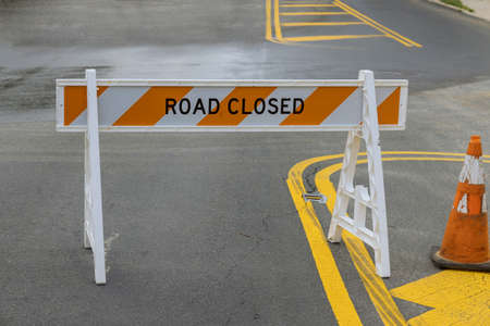 Closed road text sign, street barriers and traffic cones on empty highway, cloudy blue sky and USA countryside background. Construction safety, roadwork in progress. 3d illustration