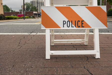 Police patrol car at yellow protective barrier at street construction site. Warning road sign about utility work