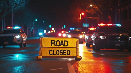 Construction barriers indicate road closure at a busy urban intersection during the night