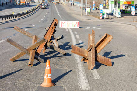 War of Russia against Ukraine. Antitank metal hedgehogs and mined roadsides of the city road on the streets of Kyiv. copyspace.
