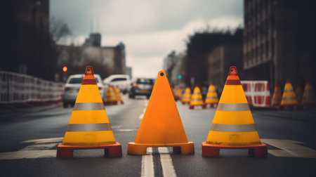 A busy urban scene captures orange traffic cones lining the road during sunset, emphasizing traffic safety and management amid ongoing transportation activities.