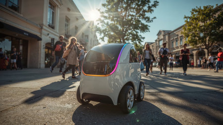 Small autonomous delivery robot with a sleek design moving through a crowded city street. Sunlight highlights the scene, with people walking in the background.