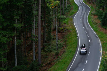 Top view of a moving car with motion blur effect. Transport on a forest road in summer.