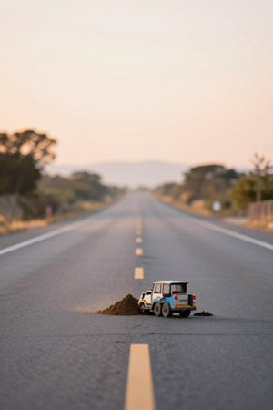 Toy car on a journey down a road with a sunset backdrop creates a whimsical scene