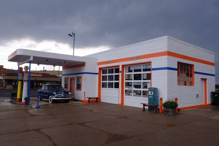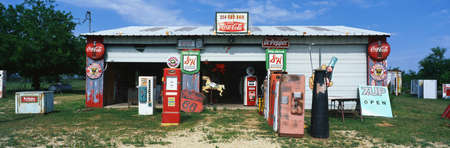 This is an old gas station with the original pumps and vintage signs. It is a piece of roadside America.