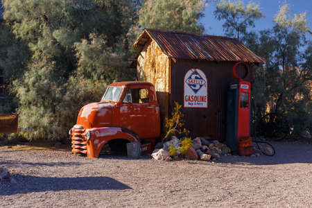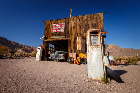 Nelson Ghost Town, Nevada, USA - 4 October, 2019: Abandoned gas station with old rusty classic car in Nelson Ghost Town, Nelson Cutoff Rd, Searchlight, Nevada, USA