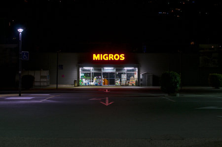 Agno, Ticino, Switzerland - 23rd July 2019 : View of a Migros Supermarket entrance at night. Migros is the biggest retail and wholesale company in Switzerland