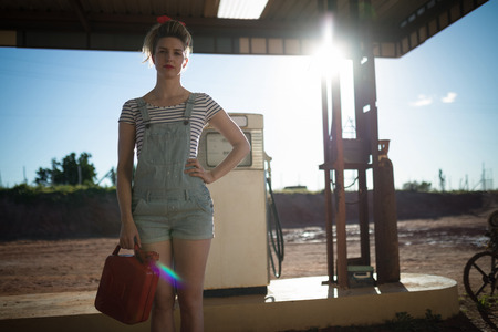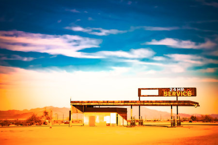 Old gas station in the desert at sunset. Shallow depth of field. High Pop Art styled colour